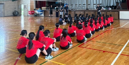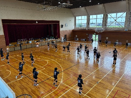 あいにくの天気で蒸し暑い体育館でしたが、長島中、陽和中、光風中から集まった選手48名とスタッフ5名で、元気に楽しく活動しました。